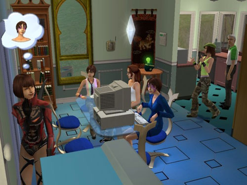 Note the old house in the background. The new house is kind of interesting, being on a slope and having a walk-in basement (inspired by Sita although not nearly as good as hers!). One novel feature is that the only way to get between floors is via the upstairs outside balcony. *8) The place is still quite bare: they brought over about 10K from the old house in the form of some expensive art, but that only paid for the house (it's pretty big) and basic furnishings. With Georgia's salary they'll be able to buy more stuff pretty quickly, though. (I forget whether I kept the pink siding on the side wall there, or replaced it with brick.)